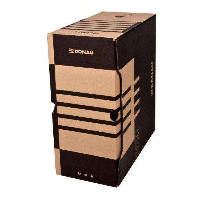 Archívny box z trojvrstvovej lepenky s certifikátom FSC® (drevo na jej výrobu pochádza z lesov, obhospodarovaných udržateľným spôsobom), bez obsahu kyseliny (pH 7,5). Vhodný na archiváciu dokumentov do formátu A4 s otvorom na ľahkú manipuláciu. Možnosť archivovať aj zakladač Donau. Predtlače na popis na dlhšej i kratšej strane umožňuje skladovanie vo vodorovnej aj zvislej polohe. Box je využiteľný samostatne alebo v kombinácii s archivačnými krabicami. Gramáž 390 g. Väčšie balenie 20 ks.
