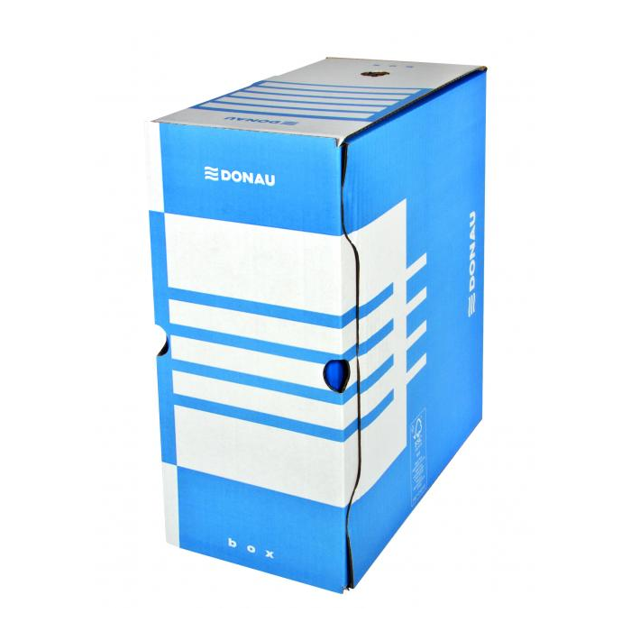 Archívny box z trojvrstvovej lepenky s certifikátom FSC® (drevo na jej výrobu pochádza z lesov, obhospodarovaných udržateľným spôsobom), bez obsahu kyseliny (pH 7,5). Vhodný na archiváciu dokumentov do formátu A4 s otvorom na ľahkú manipuláciu. Možnosť archivovať aj zakladač Donau. Predtlače na popis na dlhšej i kratšej strane umožňuje skladovanie vo vodorovnej aj zvislej polohe. Box je využiteľný samostatne alebo v kombinácii s archivačnými krabicami. Gramáž 390 g. Väčšie balenie 20 ks.