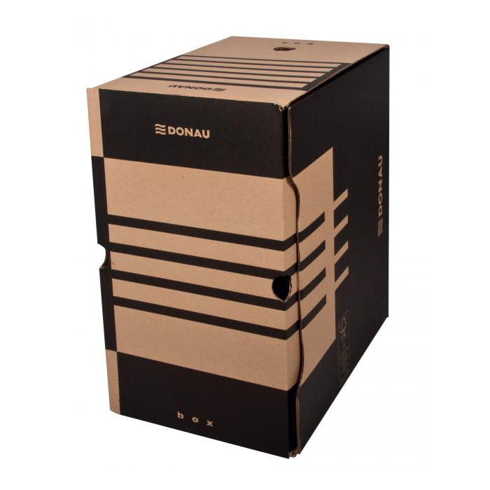 Archívny box z trojvrstvovej lepenky s certifikátom FSC® (drevo na jej výrobu pochádza z lesov, obhospodarovaných udržateľným spôsobom), bez obsahu kyseliny (pH 7,5). Vhodný na archiváciu dokumentov do formátu A4 s otvorom na ľahkú manipuláciu. Možnosť archivovať aj zakladač Donau. Predtlače na popis na dlhšej i kratšej strane umožňuje skladovanie vo vodorovnej aj zvislej polohe. Box je využiteľný samostatne alebo v kombinácii s archivačnými krabicami. Gramáž 390 g. Väčšie balenie 20 ks.