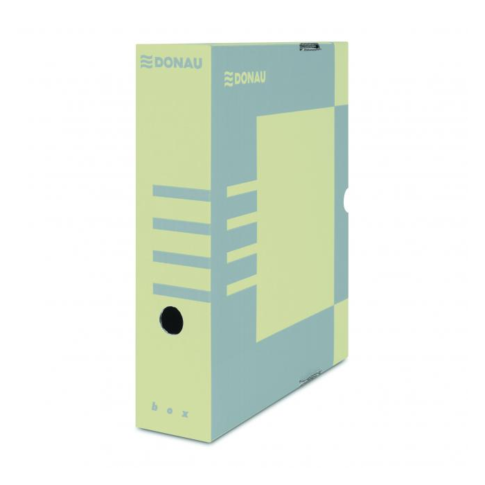 Archívny box z trojvrstvovej lepenky s certifikátom FSC® (drevo na jej výrobu pochádza z lesov, obhospodarovaných udržateľným spôsobom), bez obsahu kyseliny (pH 7,5). Vhodný na archiváciu dokumentov do formátu A4 s otvorom na ľahkú manipuláciu. Možnosť archivovať aj zakladač Donau. Predtlače na popis na dlhšej i kratšej strane umožňuje skladovanie vo vodorovnej aj zvislej polohe. Box je využiteľný samostatne alebo v kombinácii s archivačnými krabicami. Gramáž 390 g. Rozmery 297x80x339mm. Väčšie balenie 20 ks.