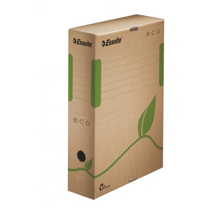 Box z archivačného systému Esselte ECO navrhnutý so zeleným prístupom. 100% recyklovateľný s 85% podielom spotrebiteľského odpadu, certifikovaný FSC. Veľkosť optimalizovaná iba na papiere A4 s cieľom minimalizovať odpad pri výrobe.
