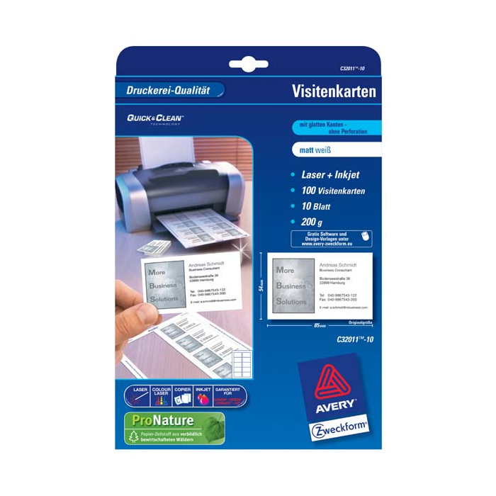 Ako často vy alebo vaši kolegovia čakáte na vizitky od výrobcu? Už nemusíte čakať! Vytlačte si sami profesionálne vizitky s hladkými hranami behom okamžiku. Môžete taktiež ľahko a rýchle upravovať nutné zmeny na vizitkách. A na rozdiel od výrobcu môžete tlačiť malé množstvá a šetriť tak papier. Vďaka Avery Zweckform Quick & Clean™ technológii môžete rýchle a presne vybrať vizitky z archu pri zachovaní dokonale hladkých hrán.