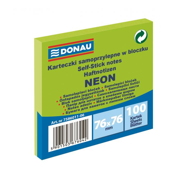 Bloček DONAU 76 x 76 mm, neónová zelená, 100 lístkov
