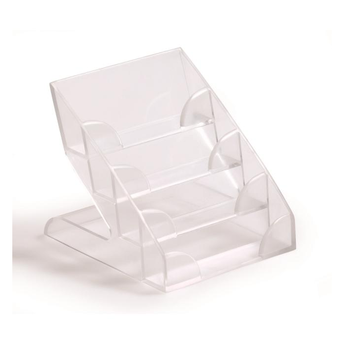 Priehľadný box z plastu so 4 rovnocennými priehradkami na skladovanie vizitiek. Kapacita 240 vizitiek. Možnosť spájania viacerých boxov pomocou spájacieho prvku. Farba číra.