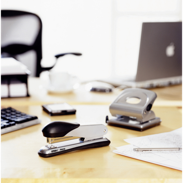 `Predieruje až 25 listov papiera (80 gsm) Pevná kovová konštrukcia zaisťuje dokonalé výsledky dierovania Jednoduché skladovanie vďaka uzamykateľnému ramenu