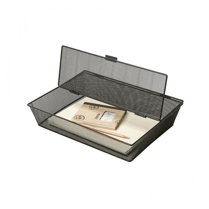 Priečinok na dokumenty a časopisy s vekom z kovovej sieťoviny potiahnutej lakom. Formát A4. Rozmery (š × v × h) 390 × 300 × 85 mm. Farba čirna.