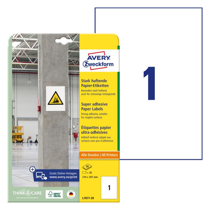 Biele, extrémne priľnavé papierové etikety vo formáte 210 x 297 mm sú dvakrát pevnejšie ako bežné papierové etikety, a preto sú vhodné najmä na označovanie a označovanie produktov a inventára a na vytváranie upozornení - a bezpečnostných pokynov resp. nápisy v interiéri! Papierové štítky tiež dobre priľnú na ťažké povrchy, ako sú nerovné, drsné, vlhké alebo prašné povrchy pri rôznych teplotách. Môžete sa spoľahnúť na zaručený chod tlačiarne bez zaseknutia bez akýchkoľvek usadenín lepidla v tlačiarni. Etikety je možné tlačiť na všetkých bežných laserových a atramentových tlačiarňach.