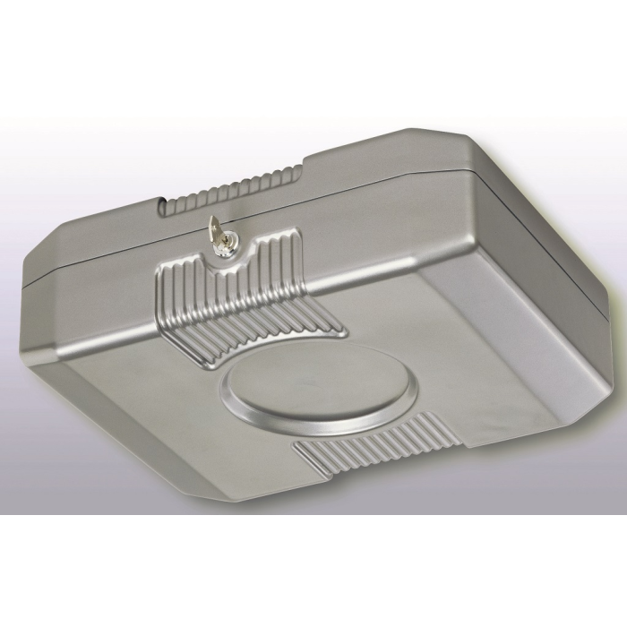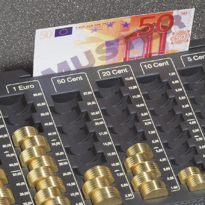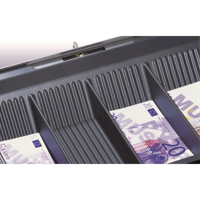 Pokladnička z povrchovo upravenej ocele vybavená mincovou priehradkou s ôsmimi oddielmi na eurá a centy v maximálnej hodnote 233,90 Euro. Štyri prístupné priehradky na bankovky, priestor na poukážky a stravné lístky v spodnej časti. Vnútorné časti vyrobené z nárazu vzdorného materiálu.Sklápateľné ergonomicky tvarované madlo prispieva k dobrému držaniu, pena na vnútornej strane veka zabraňuje premiešaniu mincí pri prenose, dvojzápadkový zámok zvyšuje bezpečnosť. Pokladničky sú vzájomne stohovateľné.