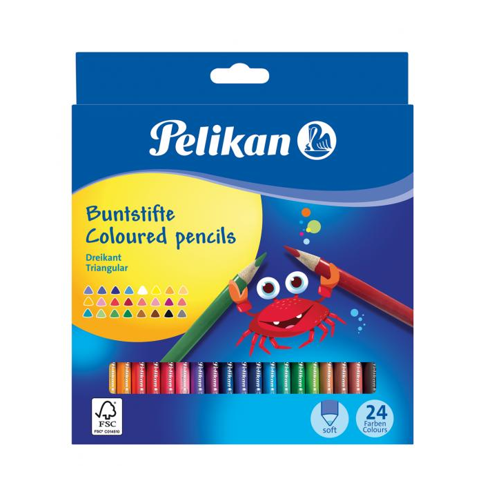 Trojhranné farbičky Pelikan, pevné, lakované, odolné voči zlomeniu. Priemer tuhy 3 mm. Balenie 24 ks.