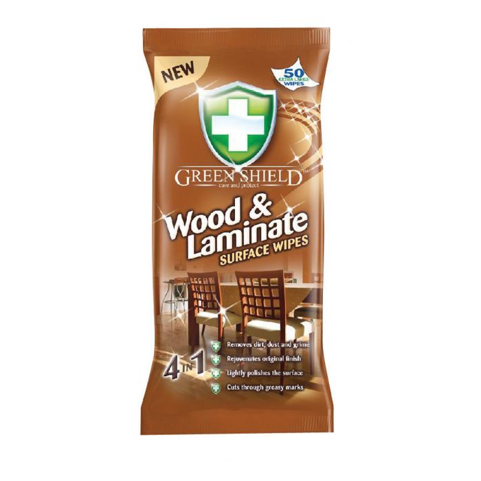 Green Shield vlhčené utierky na drevo a lamináty odstraňujú nečistoty, prach a mastnotu. Leštia povrch a obnovujú jeho štruktúru.