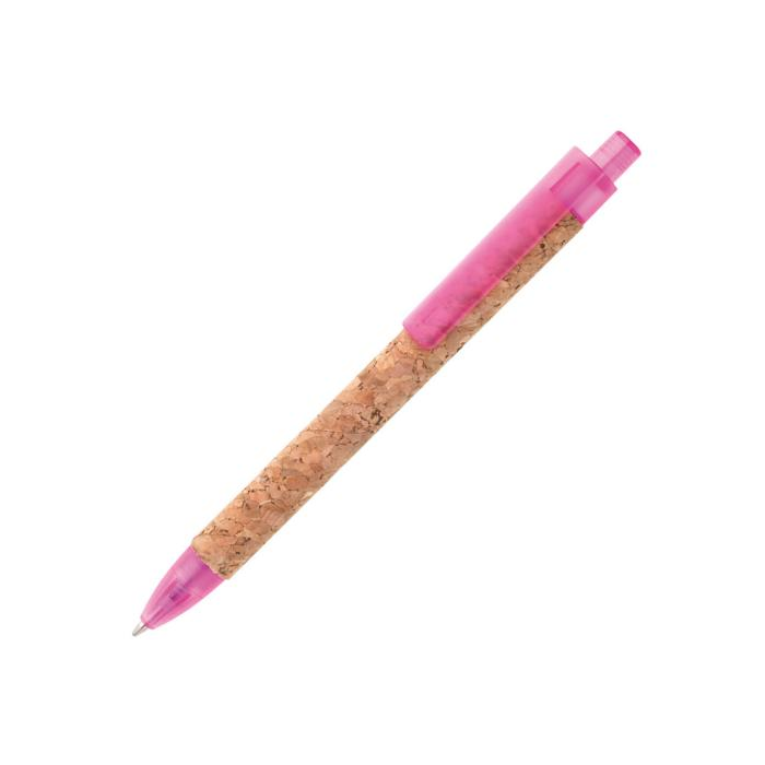Guľôčkové pero KORK s povrchom z korku, zvyšok tela je z plastu. Modrá náplň X-20. Farba ružová.