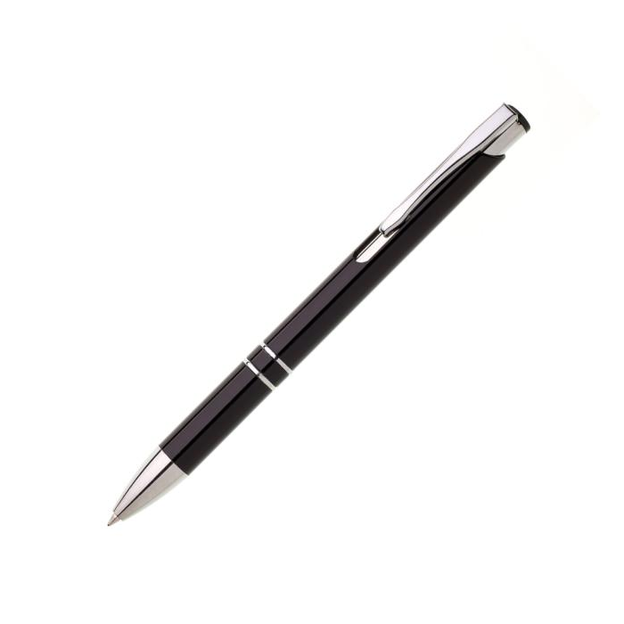 Plastové guľôčkové pero OIRA s kovovými doplnkami. Modrá náplň veľkoobjemová. Farba čierna.