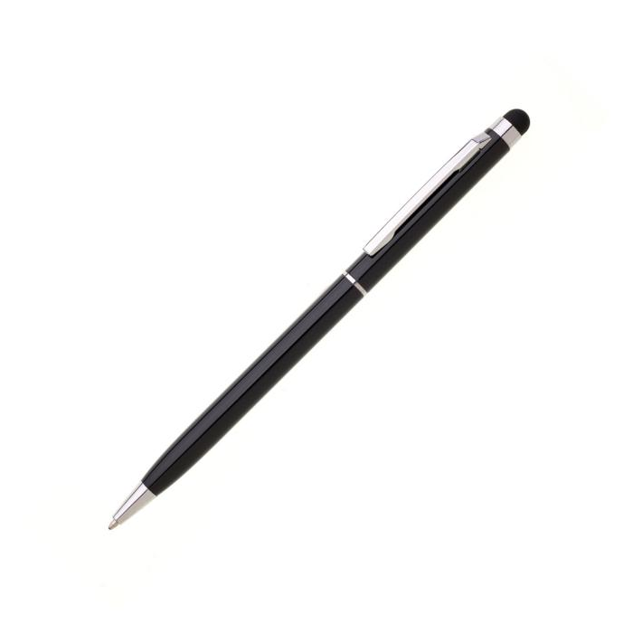 Tenké kovové guľôčkové pero s otočným mechanizmom a hrotom pre ovládanie dotykovej obrazovky. Strieborné chrómové doplnky, modrá náplň cross. Materiál hliník.