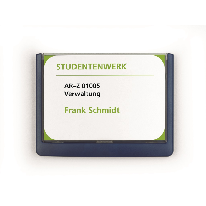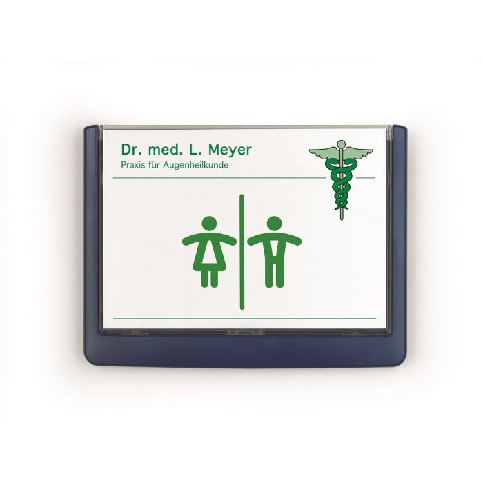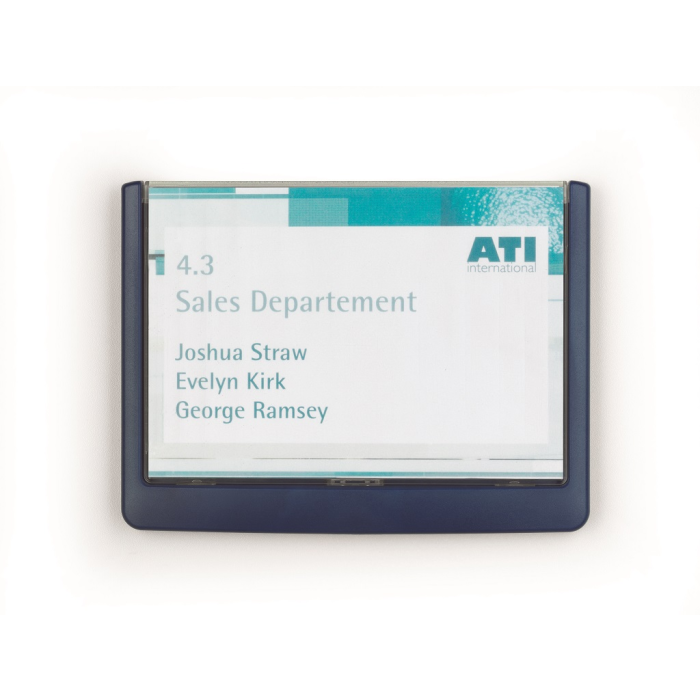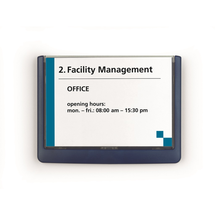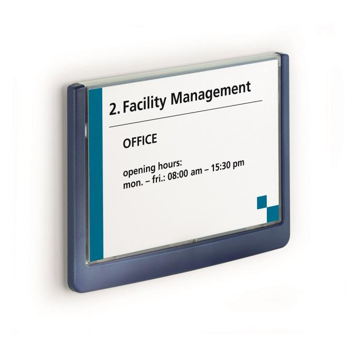 Moderná informačná tabuľka na dvere s lemom v atraktívnej modrej farbe. Predný panel sa otvára na jedno zatlačenie, a tým sa jednoducho sprístupnia vložené popisné papiere, ktoré sa môžu vymieňať podľa potrieb. Tabuľka je ideálna do kancelárií, úradov, škôl, univerzít a hotelov. Súčasťou balenia je montážna sada s názorným návodom. Namiesto pevného montovania môže byť tabuľka k povrchu aj prilepená.