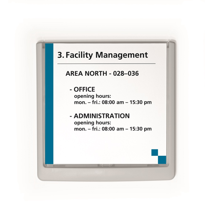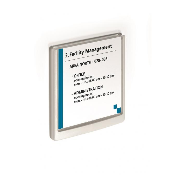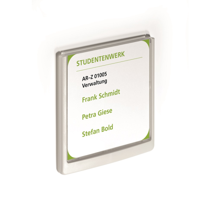 Moderná informačná tabuľka na dvere s lemom v atraktívnej bielej farbe. Predný panel sa otvára na jedno zatlačenie, a tým sa jednoducho sprístupnia vložené popisné papiere, ktoré sa môžu vymieňať podľa potrieb. Tabuľka je ideálna do kancelárií, úradov, škôl, univerzít a hotelov. Súčasťou balenia je montážna sada s názorným návodom. Namiesto pevného montovania môže byť tabuľka k povrchu aj prilepená.