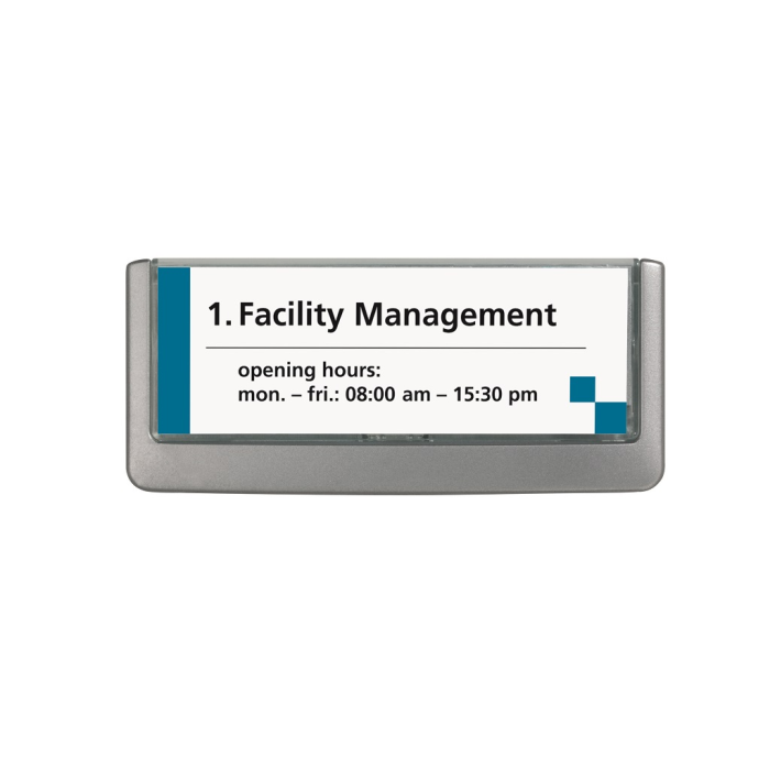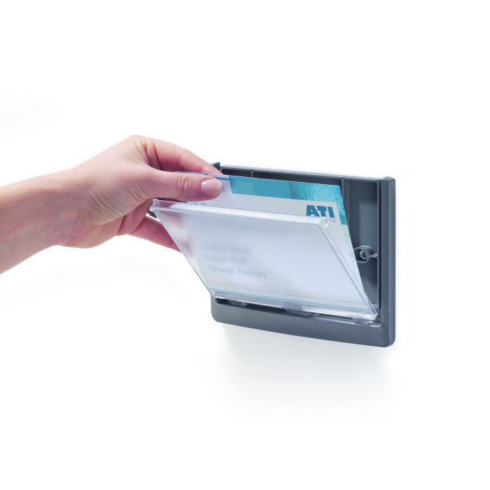 Moderná informačná tabuľka na dvere s lemom v atraktívnej grafitovej farbe. Predný panel sa otvára na jedno zatlačenie, a tým sa jednoducho sprístupnia vložené popisné papiere, ktoré sa môžu vymieňať podľa potrieb. Tabuľka je ideálna do kancelárií, úradov, škôl, univerzít a hotelov. Súčasťou balenia je montážna sada s názorným návodom. Namiesto pevného montovania môže byť tabuľka k povrchu aj prilepená.