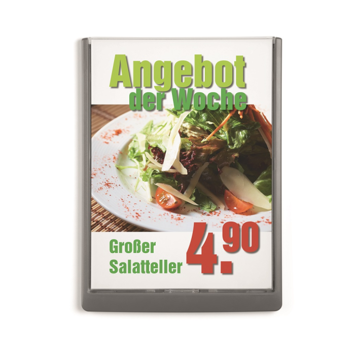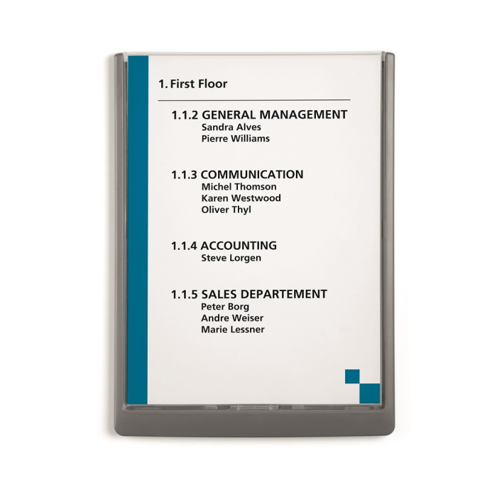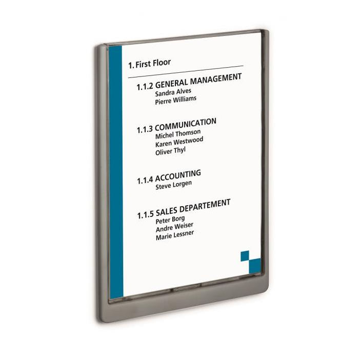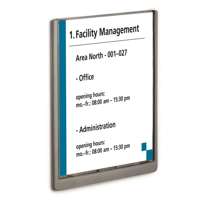 Moderná informačná tabuľka na dvere s lemom v atraktívnej grafitovej farbe. Predný panel sa otvára na jedno zatlačenie, a tým sa jednoducho sprístupnia vložené popisné papiere, ktoré sa môžu vymieňať podľa potrieb. Tabuľka je ideálna do kancelárií, úradov, škôl, univerzít a hotelov. Súčasťou balenia je montážna sada s názorným návodom. Namiesto pevného montovania môže byť tabuľka k povrchu aj prilepená.