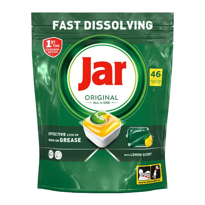 Kapsule Jar Original do automatickej umývačky riadu Všetko v jednom sú účinné hneď pri prvom umývaní a odstraňujú aj zaschnutú mastnotu tak, aby váš riad žiaril čistotou. Jar spája v jednej účinnej kapsule tekutý aj práškový prostriedok na umývanie riadu. Vysoko rozpustný obal sa rýchlo rozpúšťa, takže riad sa začína ihneď umývať. A navyše sa kapsule tak ľahko používajú. Kapsulu nie je potrebné rozbaľovať a stačí ju len vložiť do dávkovacieho zásobníka na umývací prostriedok.