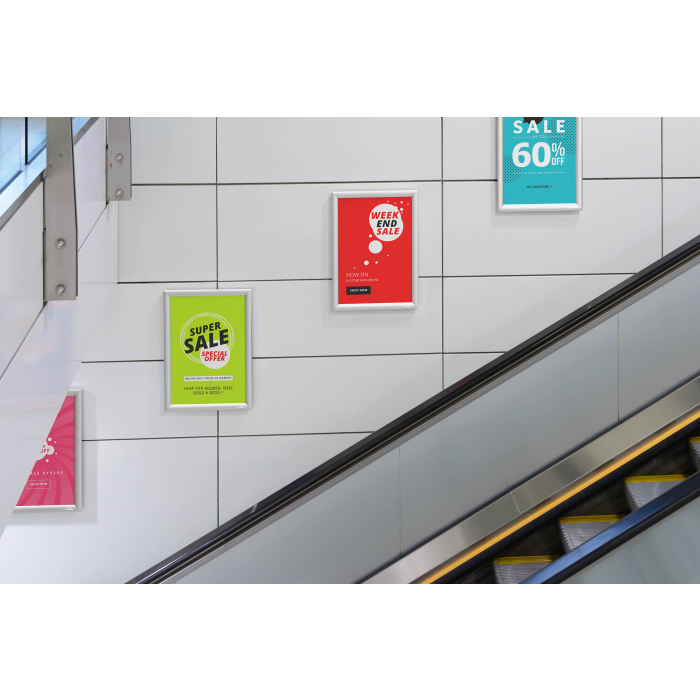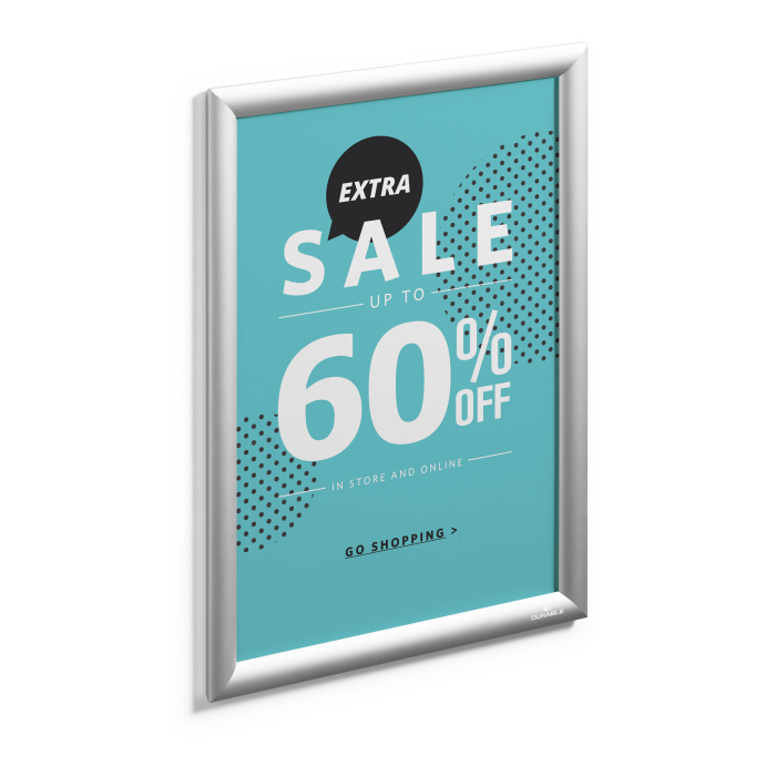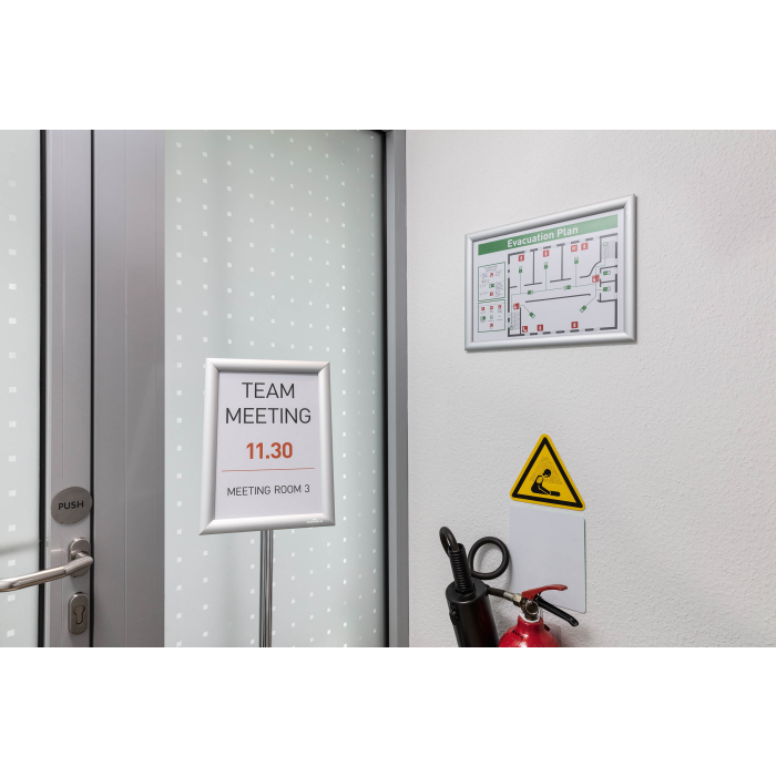 Robustný rám vo veľkosti A3 pre rýchle menenie dokumentov/motívu vďaka zaklapávaciemu systému. Odolný voči UV žiareniu vďaka nízkoreflexnej ochrannej fólii.