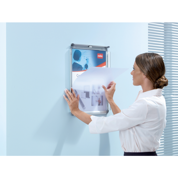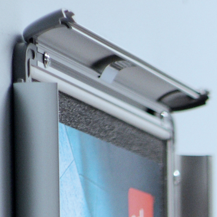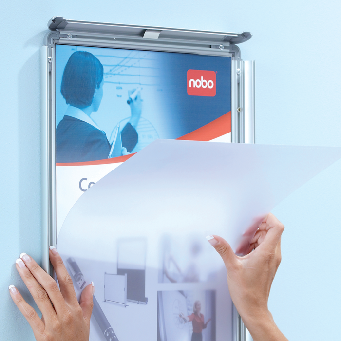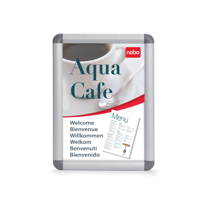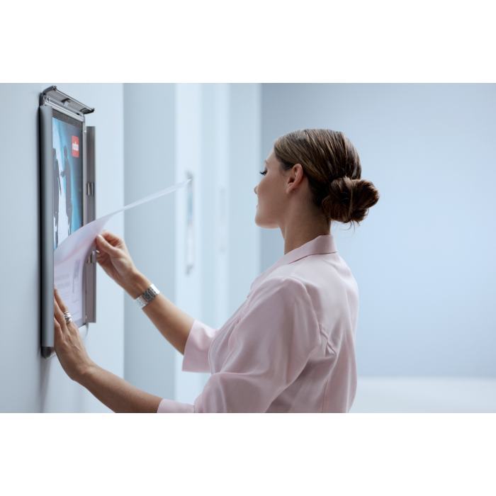 Rám na zobrazovanie informácií, plagátov alebo propagačných ponúk do interiéru aj exteriéru. Mechanizmus otvárania na  klip, antireflexná fólia z PVC na ochranu pred špinou a prachom, vkusný hliníkový rám s tmavosivými rohovými spojkami. Formát A4. Rozmery v × š × h : 248 × 370 × 17 mm. Dodávaný s montážnou sadou.