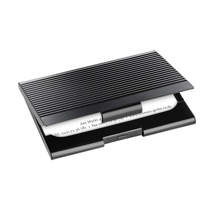 Elegantná matná čierna krabička na vizitky a magnetické karty z kvalitného kovu na bezpečné skladovanie a dokonalú ochranu až 20 vizitiek max. rozmerov 91 × 56 mm. Drážkovaný povrch je príjemný na dotyk. Vonkajšie rozmery (š × h × d) 95 × 62 × 7 mm. Farba čierna. Kapacita 20 vizitiek.