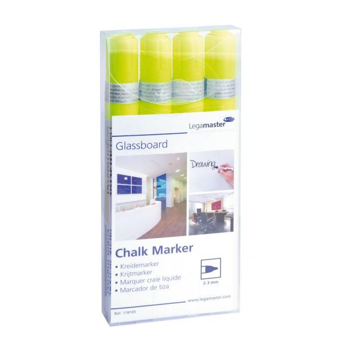 Kriedové popisovače vhodné na sklenené tabule, okná a zrkadlá. Svietiace nepriehľadné farby bez zápachu, stierateľné vlhkou utierkou. Farba žltá. Balenie 4 ks.
