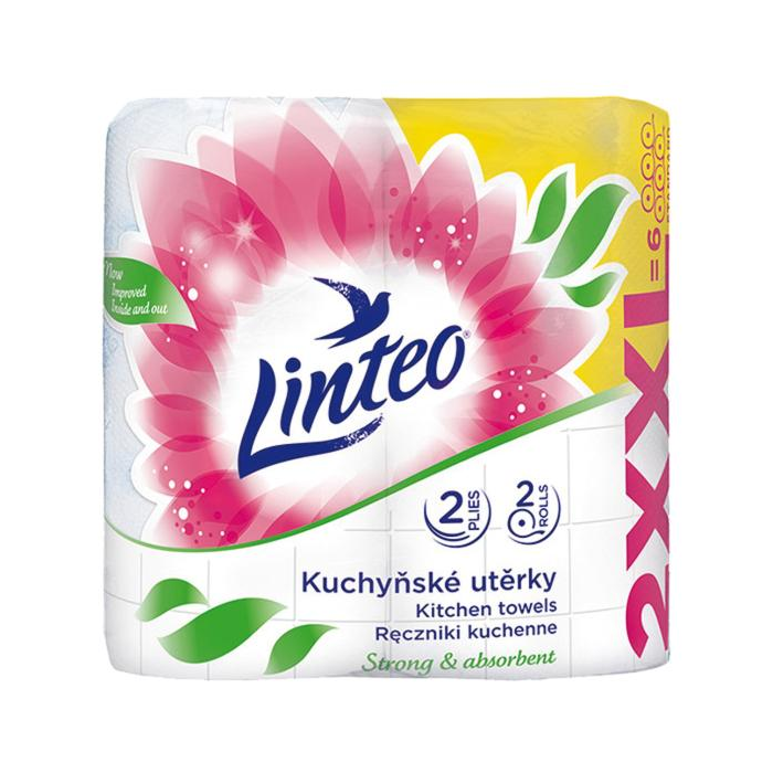 Jemné biele kuchynské utierky Linteo sú balené po 2 kusoch a sú dvojvrstvové.