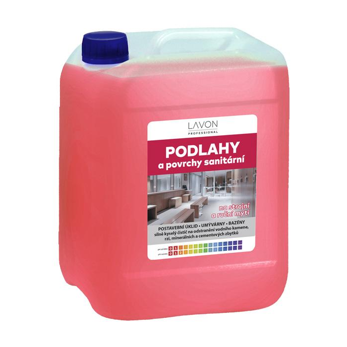 Lavon podlahy a povrchy sanitární  5 l je silne kyslý, nízkopenivý čistič na odstránenie vodného kameňa, hrdze, minerálnych a cementových zvyškov. Vhodný na dlažby, keramické obklady, umývadlá, vodovodné batérie, vane, pisoáre, WC misy, bazény.