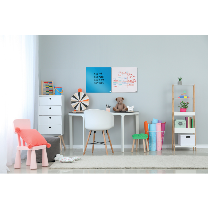 Kompaktné magnetické dielce stierateľné za sucha majú ideálnu veľkosť pre každý pracovný stôl, doma i v kancelárii. Obsahujú dva magnety, biely popisovač s mazacou hubou a montážnu penovú pásku. Farba: modrá. 360 × 360 mm.