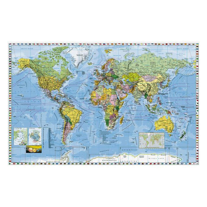 Nástenná mapa Svet politický je po celom obvode lemovaná vlajkami štátov.Na mape je vyznačené aktuálne politické rozdelenie dnešného sveta s hlavnými a väčšími mestami. Ďalej sa na mape nachádza mapka časových pasiem, vyznačenie morských prúdov, hĺbok a reliéf zeme. Mapa je vhodná na trvalé vyvesenie. Je obojstranne laminovaná a lištovaná.