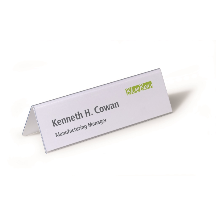 Obojstranne čitateľná stolová menovka z pevného PVC, vhodná na konferencie, recepčné pulty, ceny tovarov a popis produktov. Dodávaná s vymeniteľnou prázdnou kartou. Väčšie balenie 25 ks.