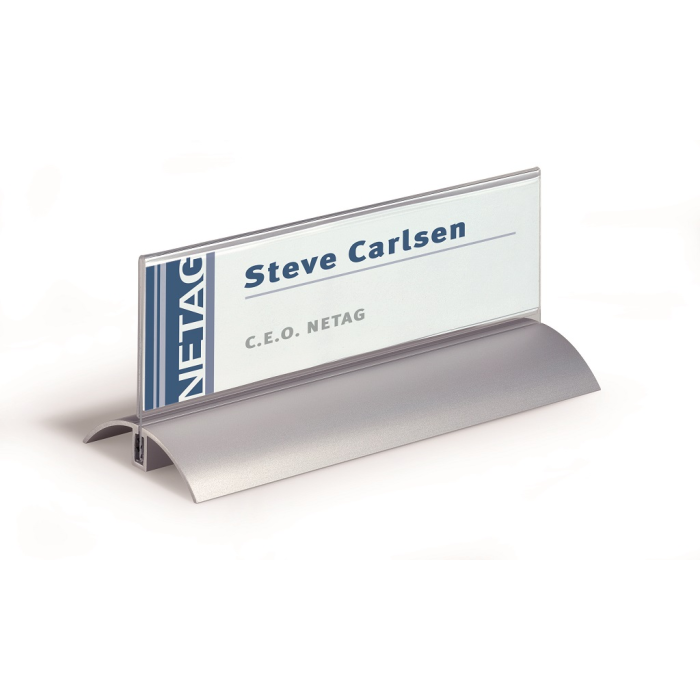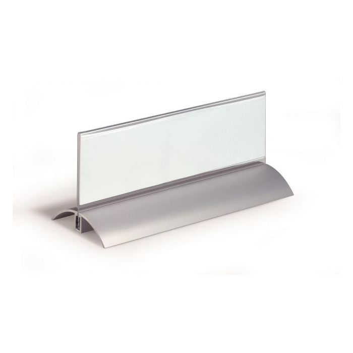 Štýlová stolová menovka s hliníkovým podstavcom. Unikátny uchytávací systém zabraňuje samovoľnému alebo neželanému vysunutiu menovky.Čítanie z oboch strán. Ideálna na konferencie, porady alebo miesta na styk so zákazníkom. Balenie 2 ks.