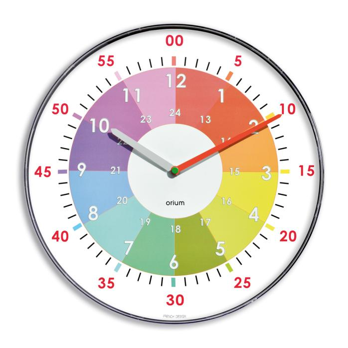 Hodiny špeciálne navrhnuté pre školy alebo špecializované inštitúcie. Umožňuje rýchle a pedagogické učenie sa času. Dvojité vytáčanie: Hodiny: od 1 do 12 hodín a od 13 do 24 hodín. Plastové puzdro a ochranné sklo: bezpečné, nerozbije sa ako sklo. Bezpečné pre deti. Čitateľnosť na 30 m. Tichý quartz strojček: pre optimálnu koncentráciu v triede.Rozmery: Priemer 30 x 2,5 cm. Čistá hmotnosť: 355 g. 1 x AA batéria súčasťou balenia. Materiál: ABS. Plnofarebné balenie. Materiál chróm.