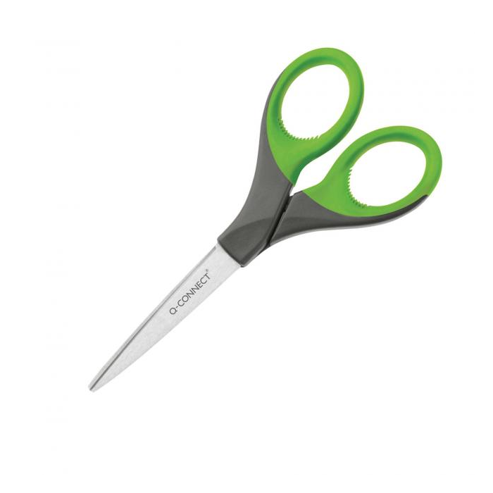Kancelárske nožnice s ostrým hrotom na strihanie papiera, kartónu, lepenky, samolepiacej pásky a pod. s pogumovaným úchytom a strihacou časťou z nehrdzavejúcej ocele. Farba zelená/ sivá. Veľkosť: 17 cm.
