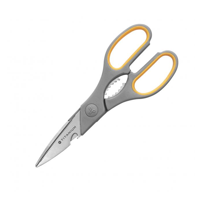 Multifunkčné nožnice s jemnou rukoväťou a strihacou časťou z nehrdzavejúcej ocele, s titaniovou povrchovou úpravou. 3 x tvrdšie než nehrdzavejúca oceľ.