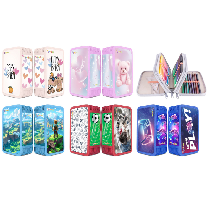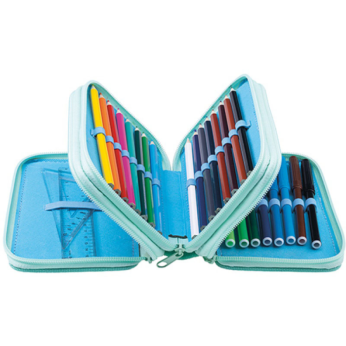 Školský peračník s výbavou v 3 priehradkách. Sada obsahuje: pravítka, 3 perá, ceruzka, guma, strúhadlo, 16 fixiek, 16 pasteliek. Mix motívov.