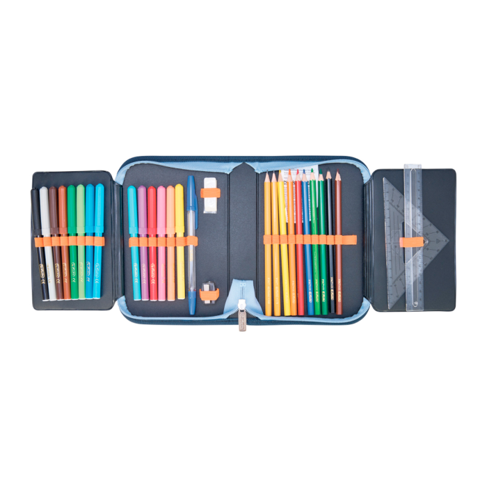 Peračník 2-klopý s výbavou, vnútorná podšívka: farebná. Výbava: 14 fixiek, 8 šesťhranných pasteliek, 2 ceruzky šesťhranné, 1 plastové strúhadlo, 1 guma, 1 plastové pravítko 16 cm, 1 trojuholníkové pravítko, 1 guľôčkové pero, 1 rozvrh hodín, 1 vizitka. Dizajn: TechMech.