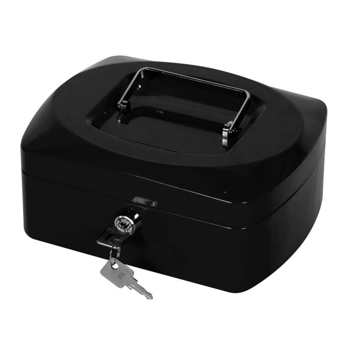 Uzamykateľná pokladnička s tvarovaným úchytom, plastovou priehradkou na mince a 2 kľúčami. Materiál pevná oceľ. Rozmery 205 × 85 × 160 mm. Farba čierna.
