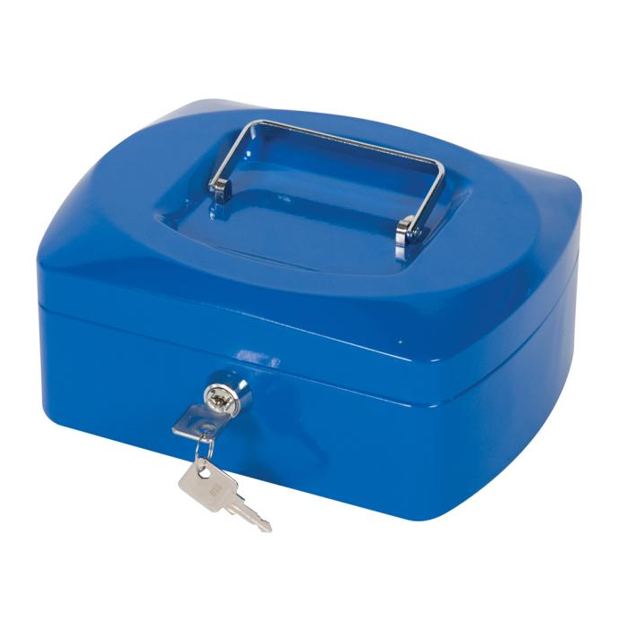 Uzamykateľná pokladnička s tvarovaným úchytom, plastovou priehradkou na mince a 2 kľúčami. Materiál pevná oceľ. Rozmery 205 × 85 × 160 mm. Farba modrá.