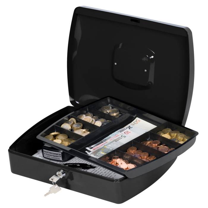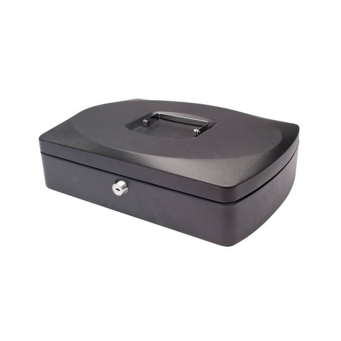 Uzamykateľná pokladnička s tvarovaným úchytom, plastovou priehradkou na mince a 2 kľúčami. Materiál pevná oceľ. Rozmery 325 × 85 × 235 mm. Farba čierna.