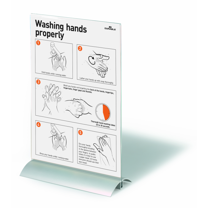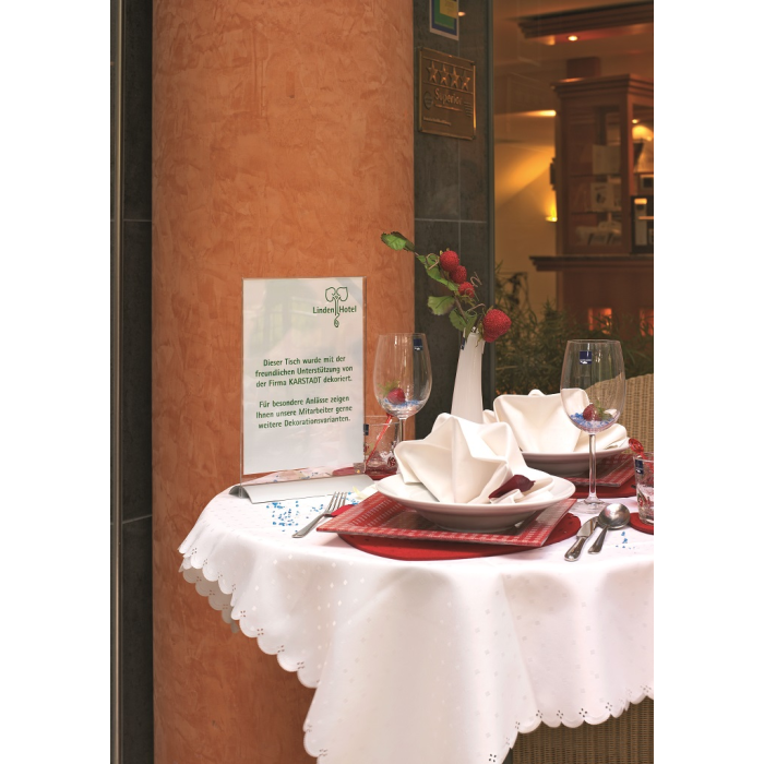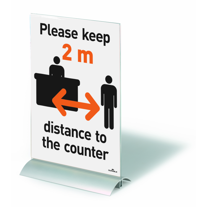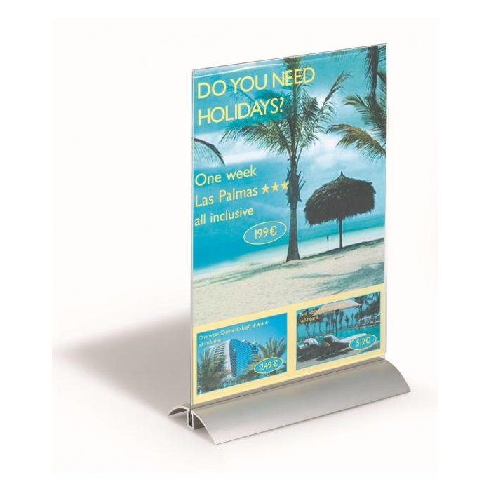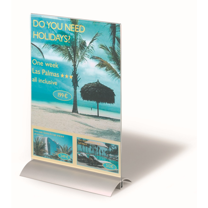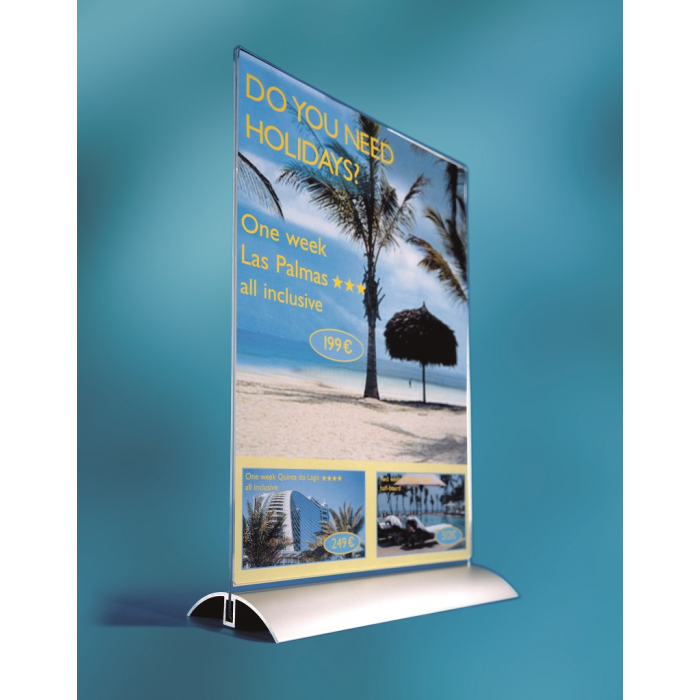 Stojan vhodný na prezentáciu ľubovoľných informácií s dobrou stabilitou. Vrchná časť vyrobená z kvalitného číreho akrylu, elegantný podstavec z hlíníka. Rozmery: 212x323x85 mm