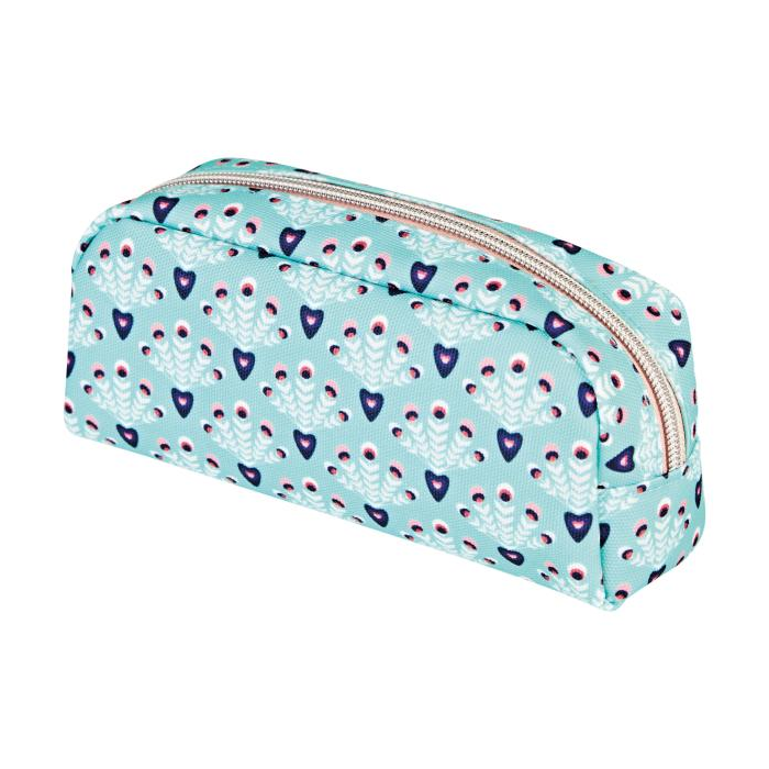 Polyesterové puzdro rozmerov 19,5,x 6,5 x 9,5 cm, jedna hlavná priehradka na zips, design páv.
