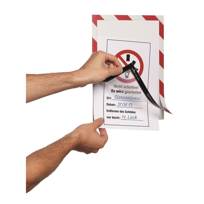 Bezpečnostný samolepiaci informačný panel s prednou magnetickou časťou. Ideálny na vystavovanie veľmi dôležitých informácií. Informácie sú čitateľné z oboch strán. Vhodný na hladké a pevné povrchy. Formát A4. Farba červeno-biela.