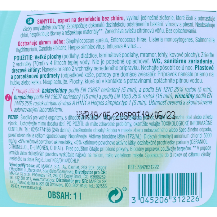 Aktívne biocídne látky (TP2/AL): Didecyl(dimethyl) amonium chlorid: 5000 mg/kg, <5% neiónové povrchovo aktívne látky, <5% katiónové povrchovo aktívne látky, dizinfekčné prostriedky, parfumy (GERANIOL, CITRONELLOL, D-LIMONEN, CITRAL). Pred použitím čítajte priložené pokyny. Biocídny výrobok používajte bezpečne.