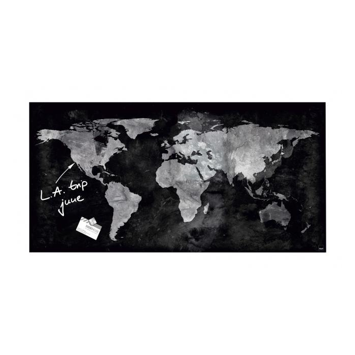 Magnetické tabule z tepelne tvrdeného bezpečnostného skla (EN 12150-1) hrúbky 15 mm s jednoduchou a bezpečnou montážou s certifi kátom TUV dodajú vašim kanceláriám, konferenčným miestnostiam, jedálňam i domácnostiam exkluzívny vzhľad. Sú popisovateľné kriedovými popisovačmi Sigel a za sucha zotierateľné utierkou z mikrovákna. Súčasťou balenia sú 3 super silné neodymové magnety a montážny materiál. Pri používaní príslušenstva Sigel je garantovaná 25-ročná záruka na magnetický sklenený povrch tabule. Rozmery 91 × 46 cm. Dizajn mapa sveta.