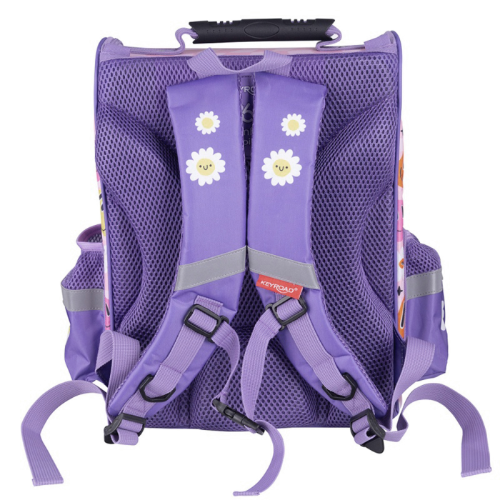 Extrémne ľahká školská taška prispôsobená veku a hmotnosti dieťaťa, čo znamená, že dodatočne nezaťažuje chrbticu a kĺby. Vhodná pre žiakov 1. - 2. ročníka ZŠ. Profilovaná a vystužená konštrukcia pomáha udržiavať správne držanie tela. Vstavané ventilačné kanáliky zaisťujú dostatočné prúdenie vzduchu, takže batoh neprehrieva chrbát dieťaťa. Široké a mäkké popruhy s nastaviteľnou dĺžkou zvyšujú komfort, nezaťažujú ramená a umožňujú prispôsobenie školskej tašky výške dieťaťa. S hrudným popruhom spájajúcim ramenné popruhy, ktorý zabraňuje skĺznutiu z pliec a odľahčuje chrbát. Dodatočný stabilizačný panel chrániaci bedrovú časť. Pogumovaná rukoväť a uzamykacie gombíky umožňujú ľahké a pohodlné držanie. Vybavená funkčnou hlavnou priehradkou s dodatočnou priehradkou, ktorá uľahčuje organizáciu a rýchly prístup k potrebným veciam. Má ďalšie vonkajšie vrecko na zips a dve bočné, elastické vonkajšie vrecká na nápoje alebo iné drobnosti. Rozmery: 38 x 28 x 18 cm. Vzor: úsmev.
