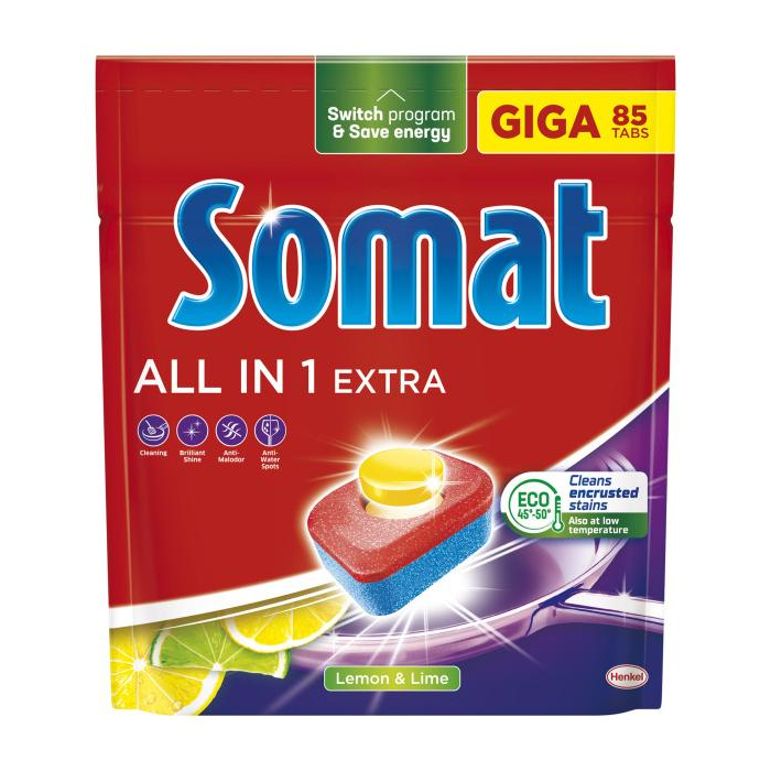 Vyskúšajte účinnú umývaciu silu s tabletami do umývačky Somat All-in-1 Extra Lemon&Lime. Ich silné a rýchlo pôsobiace zloženie sa vysporiada so zaschnutými zvyškami jedla a rozpustí škvrny od čaju a kávy, a to aj na krátke programy s nízkou teplotou. Tablety Somat All-in-1 Extra Lemon&Lime sú určené na použitie na všetky taniere, poháre, hrnčeky, fľaše, strieborný riad, príbory, hrnce a panvice vhodné do umývačky. S tabletami do umývačky Somat sú riad a poháre po každom umývaní dokonale čisté, a to aj pri použití ekologického programu s nízkou teplotou.