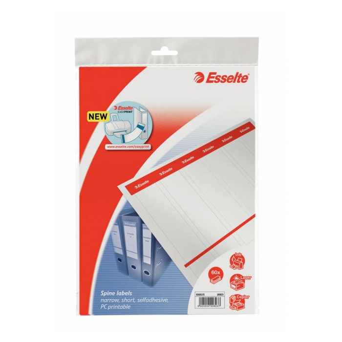 Náhradné samolepiace papierové chrbtové štítky na šírku chrbta 5 cm na identifikáciu založených dokumentov. Štítky sú vhodné na potlač do laserových a atramentových tlačiarní a kopíriek cez jednoduchý internetový nástroj `EASYPRINT` na stránke www.esselte.com/easyprint. V balení 10 hárkov (á 6 štítkov/hárok) s predperforovanými štítkami. Farba biela.