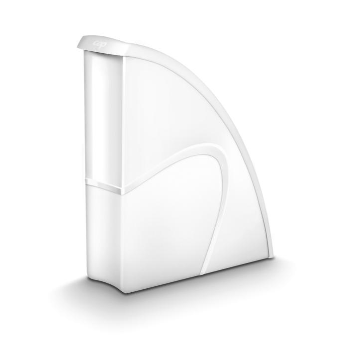 Stojan na časopisy s možnosťou vertikálneho alebo horizontálneho postavenia má elegantné línie, zvýraznené materiálom s kontrastným matným povrchom na hladkom pozadí. Vhodný na dokumenty do veľkosti 24 × 32 cm. Kapacita 700 listov (80 g / m²), rozmery 270 × 85 × 310 mm. Materiál 100% recyklovateľný vysokokvalitný plast. Väčšie balenie 10 ks. Farba biela.
