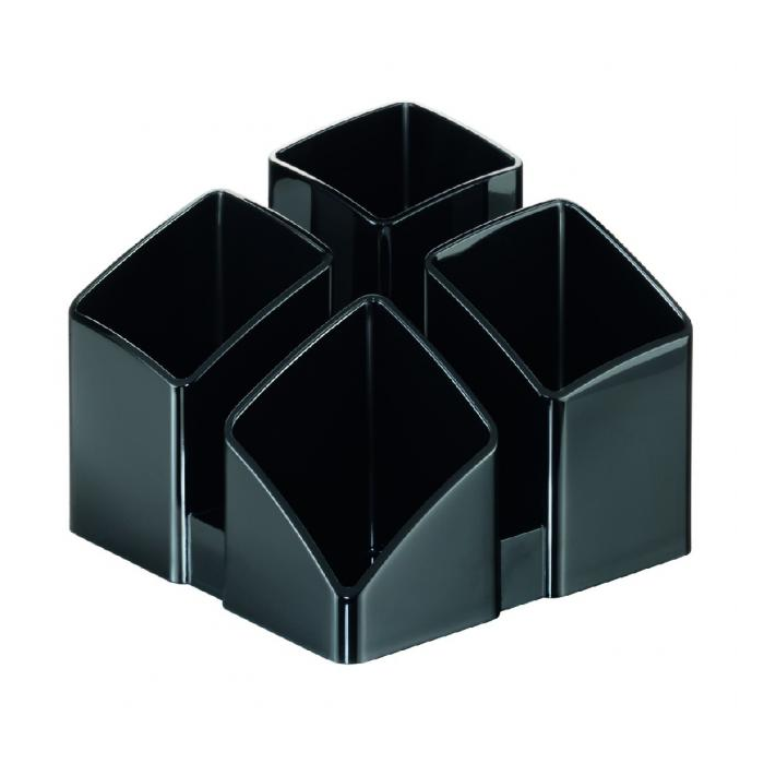 Stojan so 4 sekciami na písacie potreby a ďalšie kancelárske drobnosti. Spodná strana s protišmykovou úpravou. Materiál kvalitný plast vysokého lesku. Pri spojení 2 alebo 4 stojanov dosiahnete zaujímový moderný efekt. Rozmery 125 × 125 × 100 mm. Stojan dodávaný prázdny. Farba: čierna